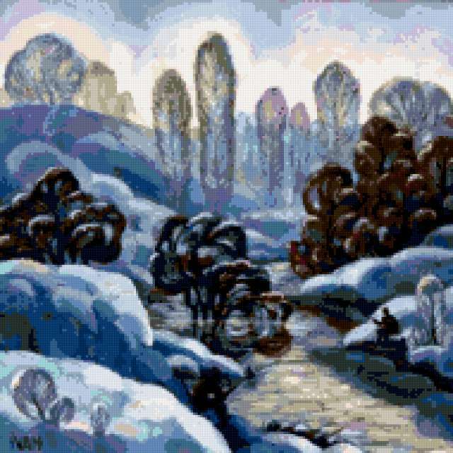 Ориентировочно так, схема вышивки «Variant 1», созданная автором Lamisa, будет выглядеть при отшиве на канве. Размер данной вышивки равен 190x190 крестов, при этом используется 41 цветов. Ключевые слова, по которым можно найти эту схему: природа, пейзаж, зима. Также, вы можете взглянуть на оригинальную картинку, соответствующую данной схеме вышивки.