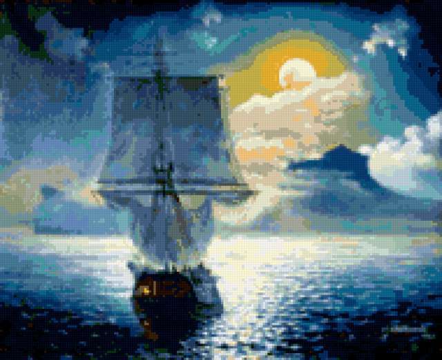 Ориентировочно так, схема вышивки «Variant 1», созданная автором Lamisa, будет выглядеть при отшиве на канве. Размер данной вышивки равен 190x155 крестов, при этом используется 55 цветов. Ключевые слова, по которым можно найти эту схему: море, корабли. Также, вы можете взглянуть на оригинальную картинку, соответствующую данной схеме вышивки.