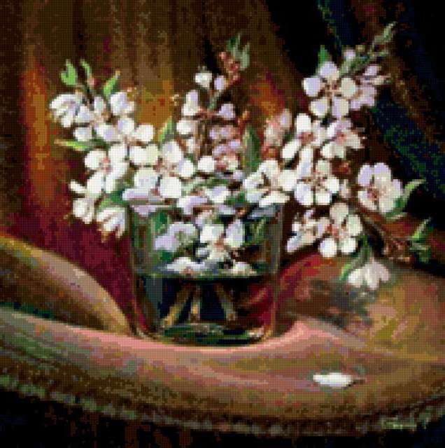 Ориентировочно так, схема вышивки «Variant 1», созданная автором Lamisa, будет выглядеть при отшиве на канве. Размер данной вышивки равен 189x190 крестов, при этом используется 76 цветов. Ключевые слова, по которым можно найти эту схему: цветы, cvety, букеты. Также, вы можете взглянуть на оригинальную картинку, соответствующую данной схеме вышивки.