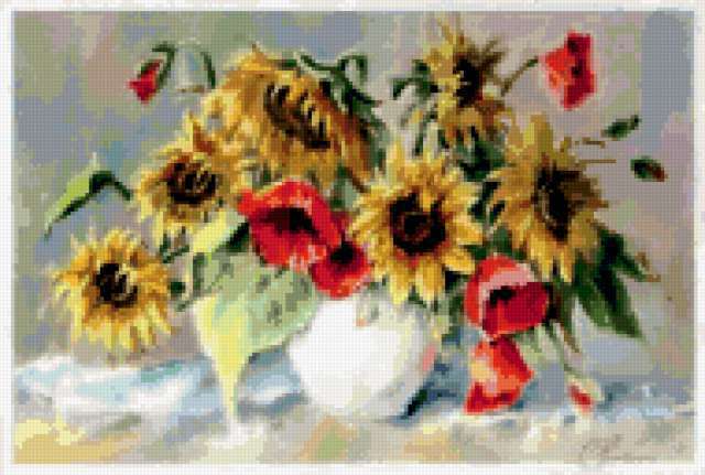 Ориентировочно так, схема вышивки «Variant 1», созданная автором Lamisa, будет выглядеть при отшиве на канве. Размер данной вышивки равен 190x128 крестов, при этом используется 86 цветов. Ключевые слова, по которым можно найти эту схему: цветы, cvety, букеты. Также, вы можете взглянуть на оригинальную картинку, соответствующую данной схеме вышивки.