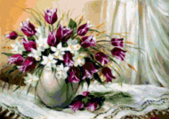 Ориентировочно так, схема вышивки «Variant 1», созданная автором Lamisa, будет выглядеть при отшиве на канве. Размер данной вышивки равен 190x134 крестов, при этом используется 69 цветов. Ключевые слова, по которым можно найти эту схему: цветы, cvety, букеты. Также, вы можете взглянуть на оригинальную картинку, соответствующую данной схеме вышивки.