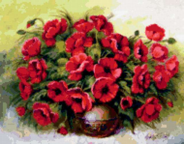 Ориентировочно так, схема вышивки «Variant 1», созданная автором Lamisa, будет выглядеть при отшиве на канве. Размер данной вышивки равен 190x149 крестов, при этом используется 76 цветов. Ключевые слова, по которым можно найти эту схему: цветы, cvety, букеты. Также, вы можете взглянуть на оригинальную картинку, соответствующую данной схеме вышивки.