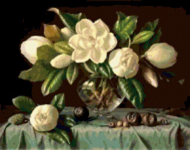Ориентировочно так, схема вышивки «Variant 1», созданная автором Lamisa, будет выглядеть при отшиве на канве. Размер данной вышивки равен 190x151 крестов, при этом используется 68 цветов. Ключевые слова, по которым можно найти эту схему: цветы, cvety, букеты, натюрморт. Также, вы можете взглянуть на оригинальную картинку, соответствующую данной схеме вышивки.
