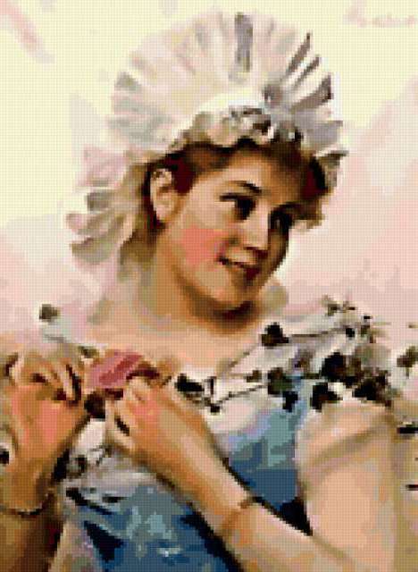 Ориентировочно так, схема вышивки «Variant 1», созданная автором Lamisa, будет выглядеть при отшиве на канве. Размер данной вышивки равен 139x190 крестов, при этом используется 72 цветов. Ключевые слова, по которым можно найти эту схему: дама, девушка, портрет. Также, вы можете взглянуть на оригинальную картинку, соответствующую данной схеме вышивки.
