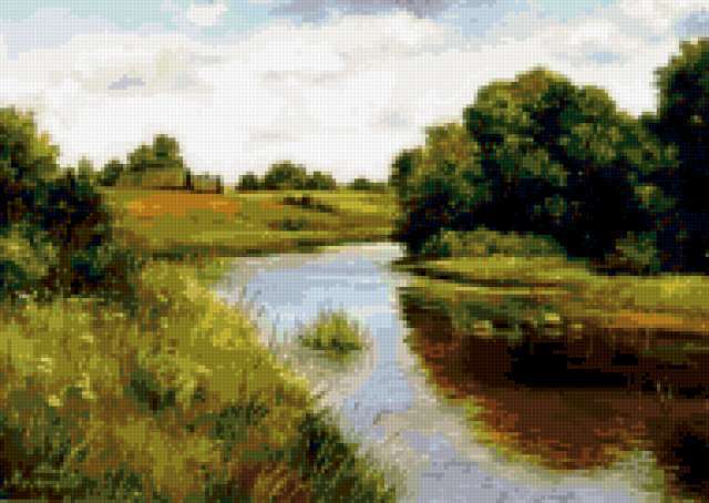 Ориентировочно так, схема вышивки «Variant 1», созданная автором Lamisa, будет выглядеть при отшиве на канве. Размер данной вышивки равен 190x135 крестов, при этом используется 60 цветов. Ключевые слова, по которым можно найти эту схему: природа, река, leto. Также, вы можете взглянуть на оригинальную картинку, соответствующую данной схеме вышивки.