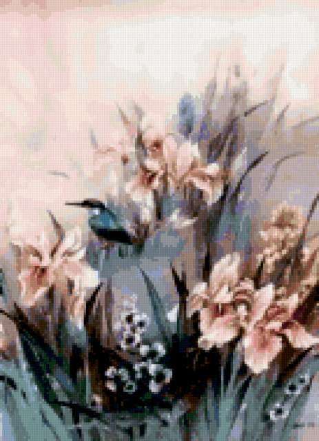 Ориентировочно так, схема вышивки «Variant 1», созданная автором Lamisa, будет выглядеть при отшиве на канве. Размер данной вышивки равен 137x189 крестов, при этом используется 75 цветов. Ключевые слова, по которым можно найти эту схему: цветы, cvety, птицы, pticy. Также, вы можете взглянуть на оригинальную картинку, соответствующую данной схеме вышивки.