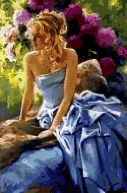Ориентировочно так, схема вышивки «Variant 1», созданная автором Lamisa, будет выглядеть при отшиве на канве. Размер данной вышивки равен 125x190 крестов, при этом используется 78 цветов. Ключевые слова, по которым можно найти эту схему: девушка, дама, цветы, cvety. Также, вы можете взглянуть на оригинальную картинку, соответствующую данной схеме вышивки.
