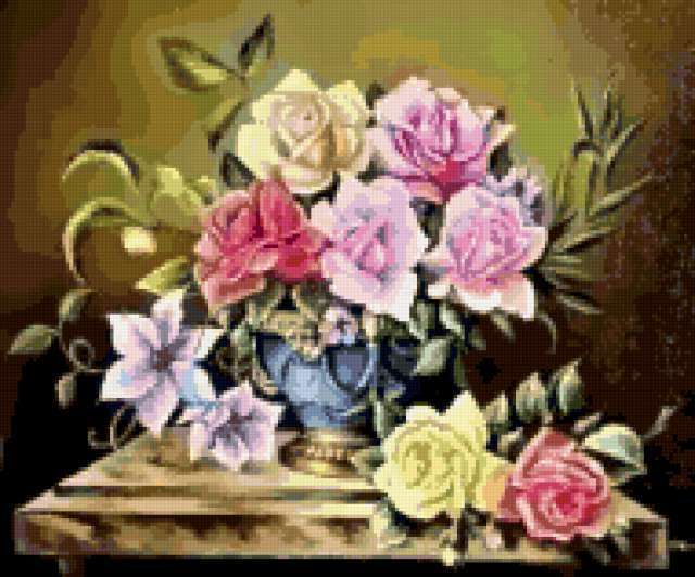 Ориентировочно так, схема вышивки «Variant 1», созданная автором Lamisa, будет выглядеть при отшиве на канве. Размер данной вышивки равен 190x158 крестов, при этом используется 84 цветов. Ключевые слова, по которым можно найти эту схему: цветы, букеты. Также, вы можете взглянуть на оригинальную картинку, соответствующую данной схеме вышивки.