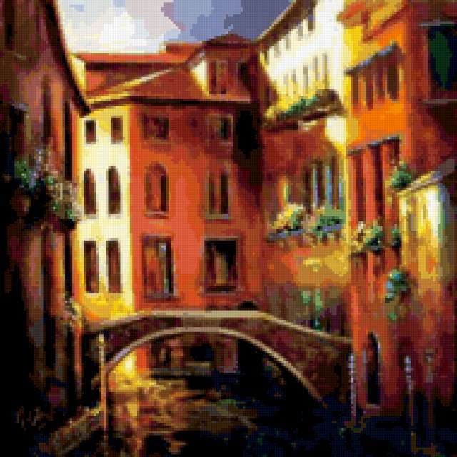 Ориентировочно так, схема вышивки «Variant 1», созданная автором Lamisa, будет выглядеть при отшиве на канве. Размер данной вышивки равен 190x190 крестов, при этом используется 77 цветов. Ключевые слова, по которым можно найти эту схему: Венеция, город, средиземноморье. Также, вы можете взглянуть на оригинальную картинку, соответствующую данной схеме вышивки.
