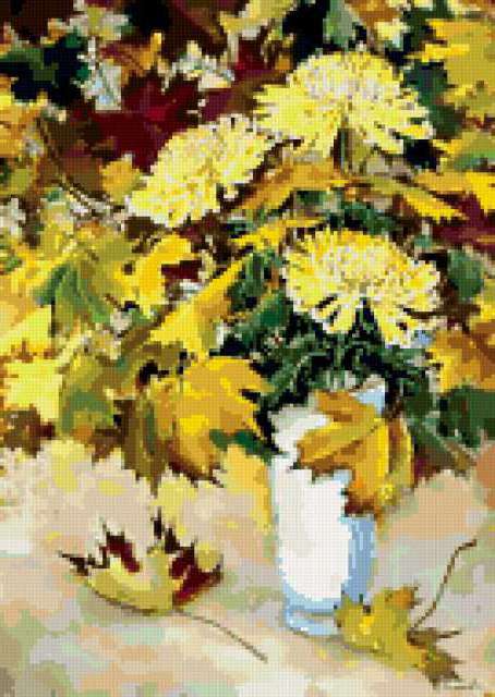 Ориентировочно так, схема вышивки «Variant 1», созданная автором Lamisa, будет выглядеть при отшиве на канве. Размер данной вышивки равен 135x190 крестов, при этом используется 58 цветов. Ключевые слова, по которым можно найти эту схему: цветы, cvety, букеты. Также, вы можете взглянуть на оригинальную картинку, соответствующую данной схеме вышивки.