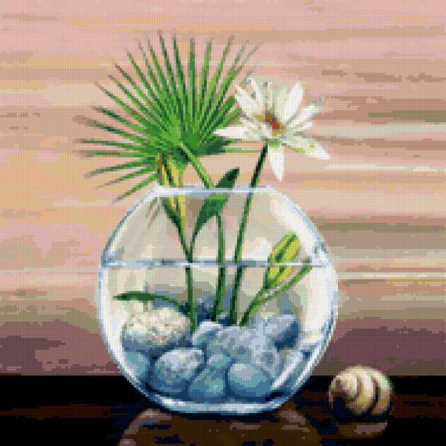Ориентировочно так, схема вышивки «Variant 1», созданная автором Lamisa, будет выглядеть при отшиве на канве. Размер данной вышивки равен 190x190 крестов, при этом используется 55 цветов. Ключевые слова, по которым можно найти эту схему: цветы, cvety, букеты, натюрморт. Также, вы можете взглянуть на оригинальную картинку, соответствующую данной схеме вышивки.