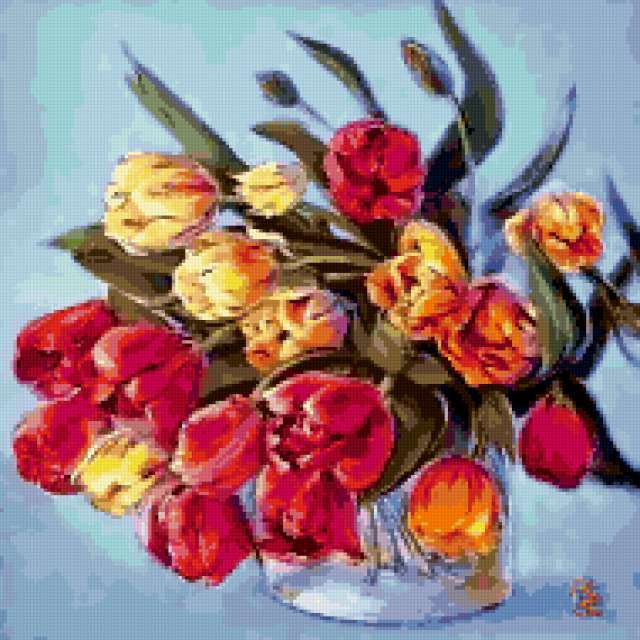 Ориентировочно так, схема вышивки «Variant 1», созданная автором Lamisa, будет выглядеть при отшиве на канве. Размер данной вышивки равен 190x190 крестов, при этом используется 75 цветов. Ключевые слова, по которым можно найти эту схему: цветы, cvety, букеты. Также, вы можете взглянуть на оригинальную картинку, соответствующую данной схеме вышивки.