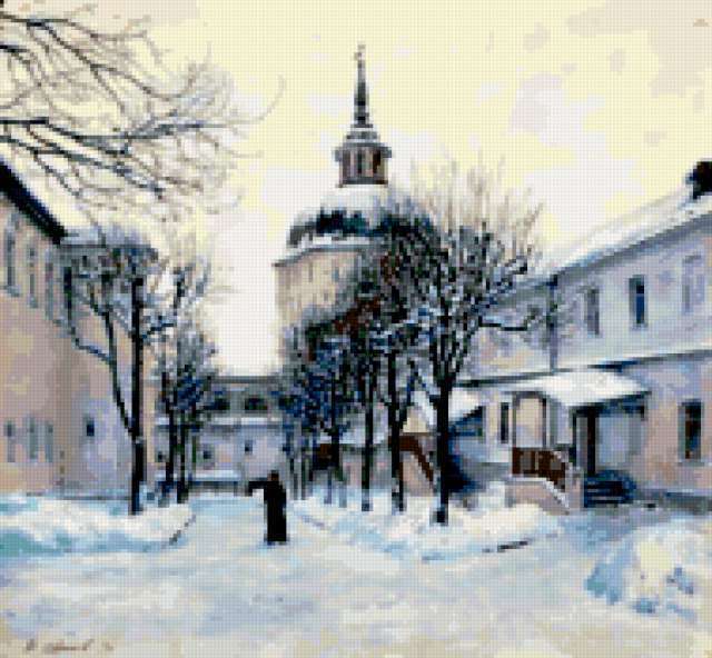 Ориентировочно так, схема вышивки «Variant 1», созданная автором Lamisa, будет выглядеть при отшиве на канве. Размер данной вышивки равен 189x175 крестов, при этом используется 58 цветов. Ключевые слова, по которым можно найти эту схему: зима, zima, религия, храмы. Также, вы можете взглянуть на оригинальную картинку, соответствующую данной схеме вышивки.