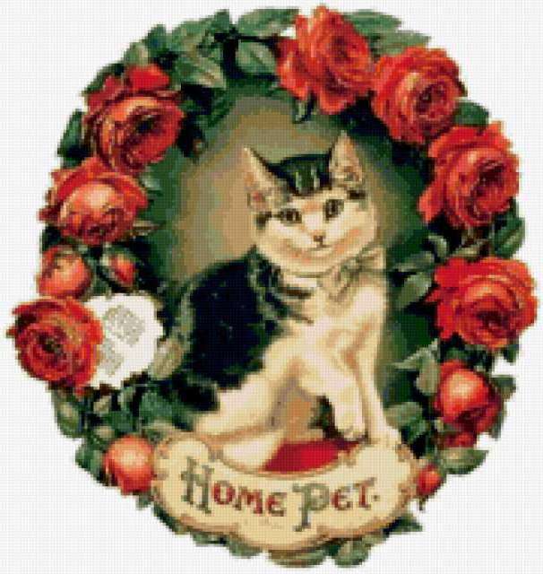 Ориентировочно так, схема вышивки «Variant 10», созданная автором Lamisa, будет выглядеть при отшиве на канве. Размер данной вышивки равен 180x190 крестов, при этом используется 76 цветов. Ключевые слова, по которым можно найти эту схему: цветы, розы, животные, кошки, retro. Также, вы можете взглянуть на оригинальную картинку, соответствующую данной схеме вышивки.
