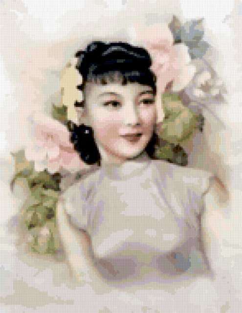Ориентировочно так, схема вышивки «Variant 11», созданная автором Lamisa, будет выглядеть при отшиве на канве. Размер данной вышивки равен 147x190 крестов, при этом используется 69 цветов. Ключевые слова, по которым можно найти эту схему: девушка, дама, цветы, Восток. Также, вы можете взглянуть на оригинальную картинку, соответствующую данной схеме вышивки.