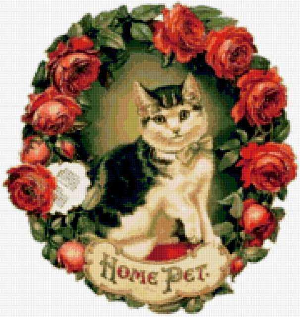 Ориентировочно так, схема вышивки «Variant 11», созданная автором Lamisa, будет выглядеть при отшиве на канве. Размер данной вышивки равен 180x190 крестов, при этом используется 81 цветов. Ключевые слова, по которым можно найти эту схему: цветы, розы, животные, кошки, retro. Также, вы можете взглянуть на оригинальную картинку, соответствующую данной схеме вышивки.