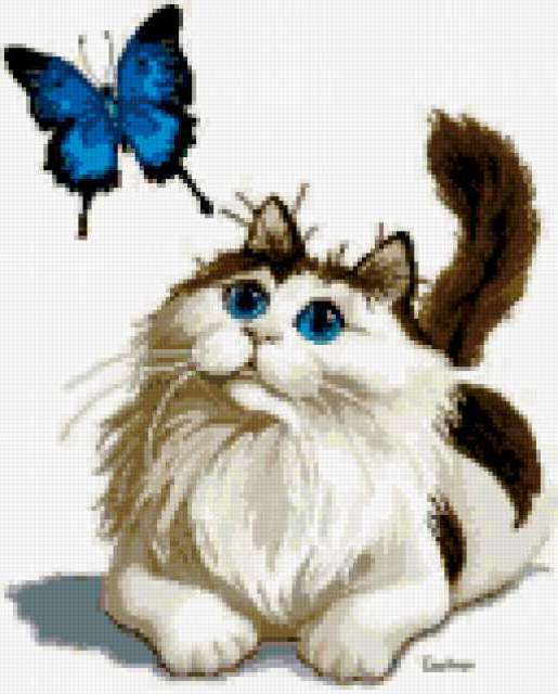 Ориентировочно так, схема вышивки «Variant 12», созданная автором Lamisa, будет выглядеть при отшиве на канве. Размер данной вышивки равен 128x159 крестов, при этом используется 54 цветов. Ключевые слова, по которым можно найти эту схему: животные, кошки, бабочка. Также, вы можете взглянуть на оригинальную картинку, соответствующую данной схеме вышивки.