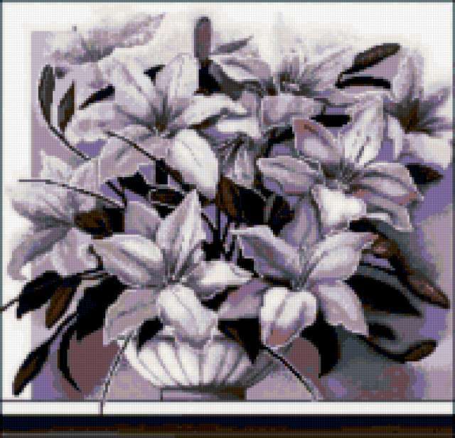 Ориентировочно так, схема вышивки «Variant 17», созданная автором Lamisa, будет выглядеть при отшиве на канве. Размер данной вышивки равен 190x183 крестов, при этом используется 44 цветов. Ключевые слова, по которым можно найти эту схему: цветы, cvety, букеты. Также, вы можете взглянуть на оригинальную картинку, соответствующую данной схеме вышивки.
