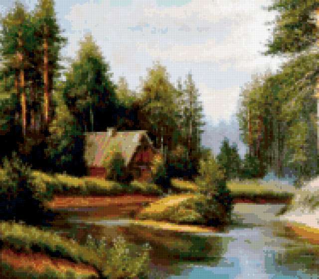 Ориентировочно так, схема вышивки «Variant 1b», созданная автором Lamisa, будет выглядеть при отшиве на канве. Размер данной вышивки равен 188x165 крестов, при этом используется 78 цветов. Ключевые слова, по которым можно найти эту схему: природа, домик, leto. Также, вы можете взглянуть на оригинальную картинку, соответствующую данной схеме вышивки.