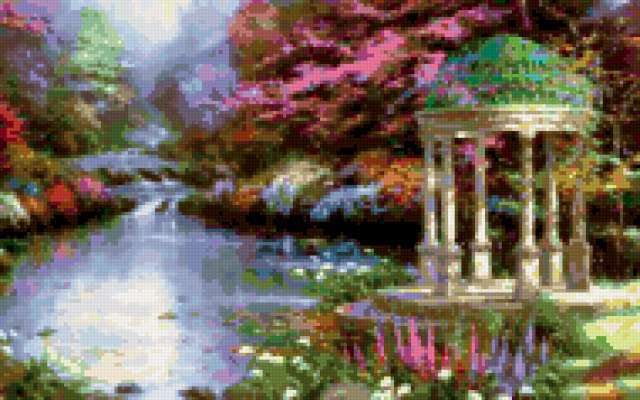 Ориентировочно так, схема вышивки «Variant 2», созданная автором Lamisa, будет выглядеть при отшиве на канве. Размер данной вышивки равен 190x119 крестов, при этом используется 80 цветов. Ключевые слова, по которым можно найти эту схему: пейзаж, беседка. Также, вы можете взглянуть на оригинальную картинку, соответствующую данной схеме вышивки.