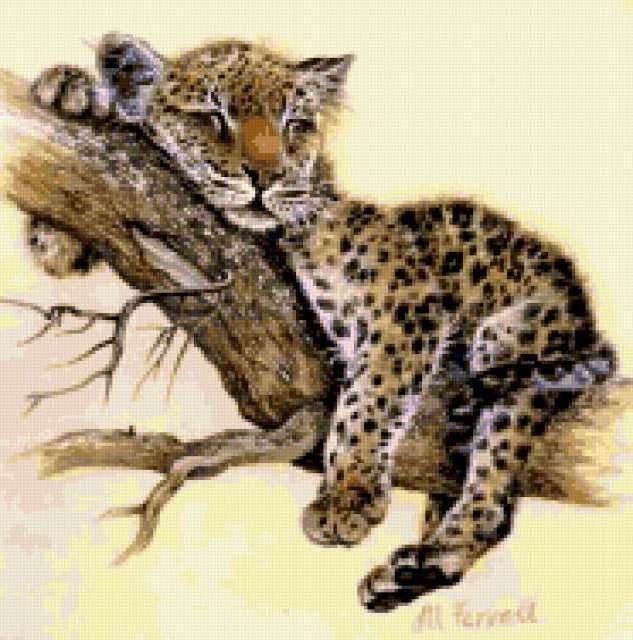 Ориентировочно так, схема вышивки «Variant 2», созданная автором Lamisa, будет выглядеть при отшиве на канве. Размер данной вышивки равен 186x188 крестов, при этом используется 51 цветов. Ключевые слова, по которым можно найти эту схему: животные, леопард, подушка. Также, вы можете взглянуть на оригинальную картинку, соответствующую данной схеме вышивки.