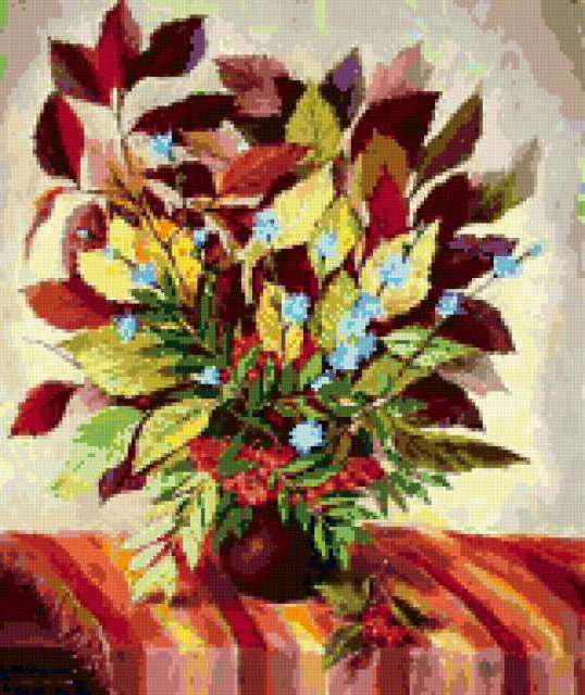Ориентировочно так, схема вышивки «Variant 2», созданная автором Lamisa, будет выглядеть при отшиве на канве. Размер данной вышивки равен 160x190 крестов, при этом используется 54 цветов. Ключевые слова, по которым можно найти эту схему: цветы, букеты. Также, вы можете взглянуть на оригинальную картинку, соответствующую данной схеме вышивки.