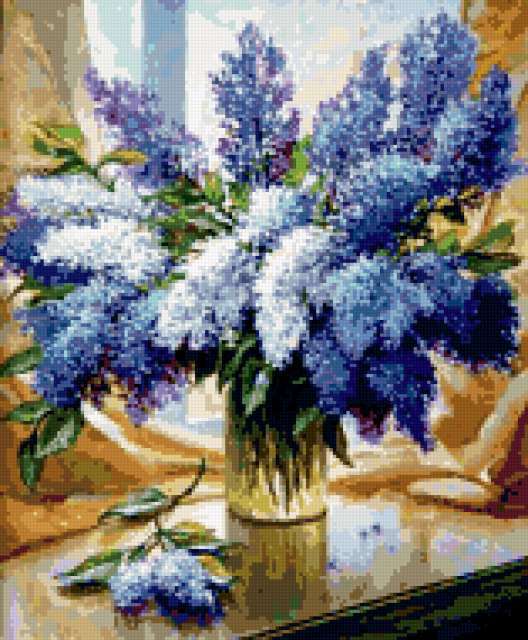 Ориентировочно так, схема вышивки «Variant 2», созданная автором Lamisa, будет выглядеть при отшиве на канве. Размер данной вышивки равен 157x190 крестов, при этом используется 62 цветов. Ключевые слова, по которым можно найти эту схему: цветы, букеты, сирень. Также, вы можете взглянуть на оригинальную картинку, соответствующую данной схеме вышивки.