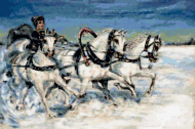 Ориентировочно так, схема вышивки «Variant 2», созданная автором Lamisa, будет выглядеть при отшиве на канве. Размер данной вышивки равен 190x126 крестов, при этом используется 67 цветов. Ключевые слова, по которым можно найти эту схему: зима, животные, лошади. Также, вы можете взглянуть на оригинальную картинку, соответствующую данной схеме вышивки.