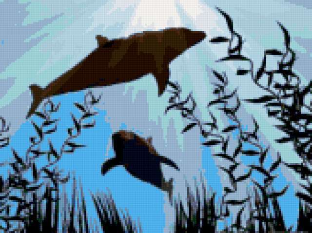 Ориентировочно так, схема вышивки «Variant 2», созданная автором Lamisa, будет выглядеть при отшиве на канве. Размер данной вышивки равен 170x127 крестов, при этом используется 31 цветов. Ключевые слова, по которым можно найти эту схему: животные, подводный мир, дельфины. Также, вы можете взглянуть на оригинальную картинку, соответствующую данной схеме вышивки.