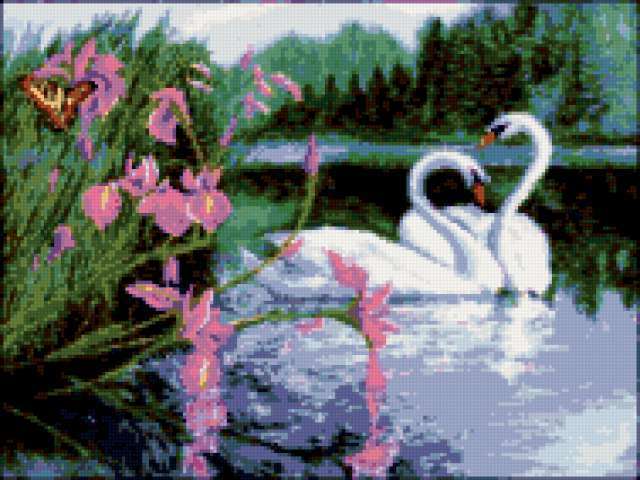 Ориентировочно так, схема вышивки «Variant 2», созданная автором Lamisa, будет выглядеть при отшиве на канве. Размер данной вышивки равен 189x142 крестов, при этом используется 45 цветов. Ключевые слова, по которым можно найти эту схему: природа, птицы, пара, бабочка, цветы. Также, вы можете взглянуть на оригинальную картинку, соответствующую данной схеме вышивки.
