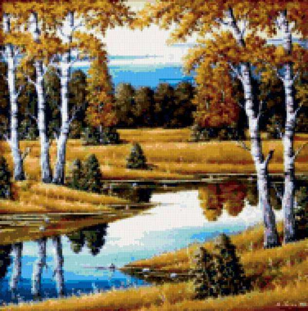 Ориентировочно так, схема вышивки «Variant 2», созданная автором Lamisa, будет выглядеть при отшиве на канве. Размер данной вышивки равен 188x190 крестов, при этом используется 65 цветов. Ключевые слова, по которым можно найти эту схему: природа, priroda, пейзаж, осень. Также, вы можете взглянуть на оригинальную картинку, соответствующую данной схеме вышивки.