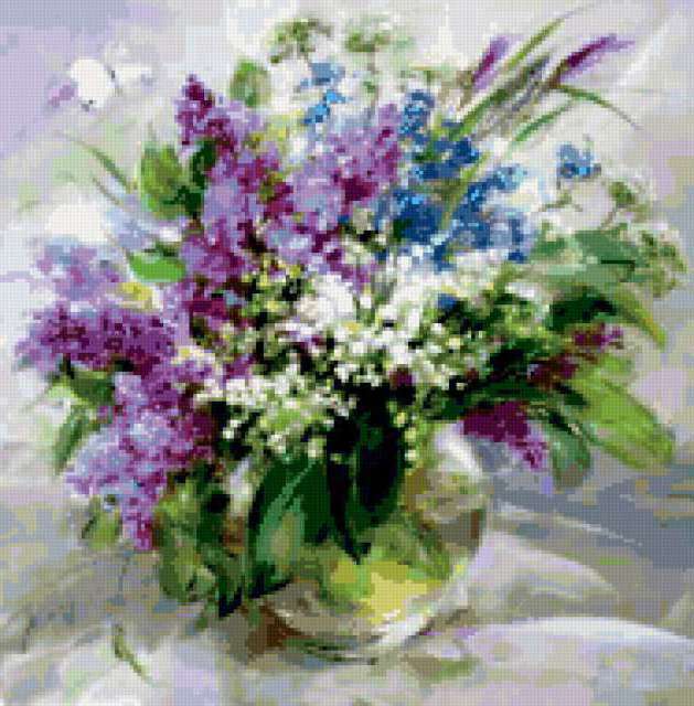 Ориентировочно так, схема вышивки «Variant 2», созданная автором Lamisa, будет выглядеть при отшиве на канве. Размер данной вышивки равен 187x190 крестов, при этом используется 77 цветов. Ключевые слова, по которым можно найти эту схему: цветы, cvety, букеты. Также, вы можете взглянуть на оригинальную картинку, соответствующую данной схеме вышивки.