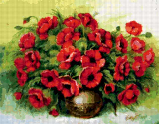Ориентировочно так, схема вышивки «Variant 2», созданная автором Lamisa, будет выглядеть при отшиве на канве. Размер данной вышивки равен 190x149 крестов, при этом используется 67 цветов. Ключевые слова, по которым можно найти эту схему: цветы, cvety, букеты. Также, вы можете взглянуть на оригинальную картинку, соответствующую данной схеме вышивки.