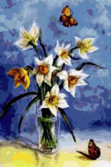 Ориентировочно так, схема вышивки «Variant 2», созданная автором Lamisa, будет выглядеть при отшиве на канве. Размер данной вышивки равен 127x190 крестов, при этом используется 71 цветов. Ключевые слова, по которым можно найти эту схему: цветы, cvety, букеты, бабочки. Также, вы можете взглянуть на оригинальную картинку, соответствующую данной схеме вышивки.
