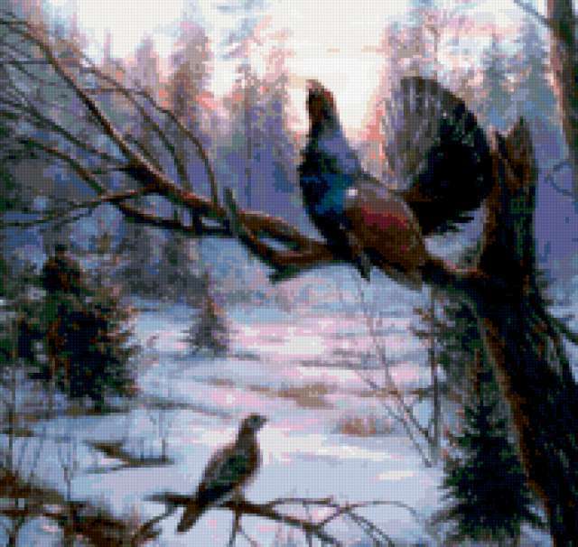 Ориентировочно так, схема вышивки «Variant 2», созданная автором Lamisa, будет выглядеть при отшиве на канве. Размер данной вышивки равен 189x179 крестов, при этом используется 67 цветов. Ключевые слова, по которым можно найти эту схему: природа, птицы, pticy, zima. Также, вы можете взглянуть на оригинальную картинку, соответствующую данной схеме вышивки.