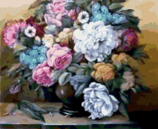 Ориентировочно так, схема вышивки «Variant 2», созданная автором Lamisa, будет выглядеть при отшиве на канве. Размер данной вышивки равен 190x155 крестов, при этом используется 83 цветов. Ключевые слова, по которым можно найти эту схему: цветы, cvety, букеты. Также, вы можете взглянуть на оригинальную картинку, соответствующую данной схеме вышивки.