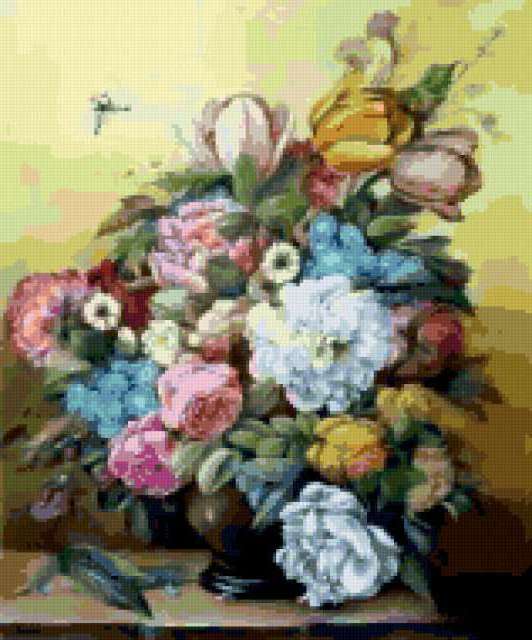Ориентировочно так, схема вышивки «Variant 2», созданная автором Lamisa, будет выглядеть при отшиве на канве. Размер данной вышивки равен 158x190 крестов, при этом используется 78 цветов. Ключевые слова, по которым можно найти эту схему: цветы, cvety, букеты. Также, вы можете взглянуть на оригинальную картинку, соответствующую данной схеме вышивки.
