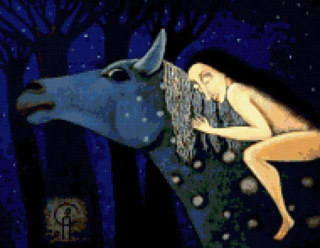 Ориентировочно так, схема вышивки «Variant 2», созданная автором Lamisa, будет выглядеть при отшиве на канве. Размер данной вышивки равен 190x147 крестов, при этом используется 47 цветов. Ключевые слова, по которым можно найти эту схему: девушка, животные, ночь, фэнтези. Также, вы можете взглянуть на оригинальную картинку, соответствующую данной схеме вышивки.