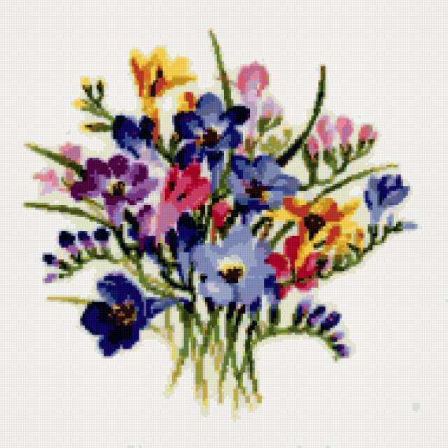 Ориентировочно так, схема вышивки «Variant 2», созданная автором Lamisa, будет выглядеть при отшиве на канве. Размер данной вышивки равен 190x190 крестов, при этом используется 51 цветов. Ключевые слова, по которым можно найти эту схему: цветы, cvety, букеты. Также, вы можете взглянуть на оригинальную картинку, соответствующую данной схеме вышивки.