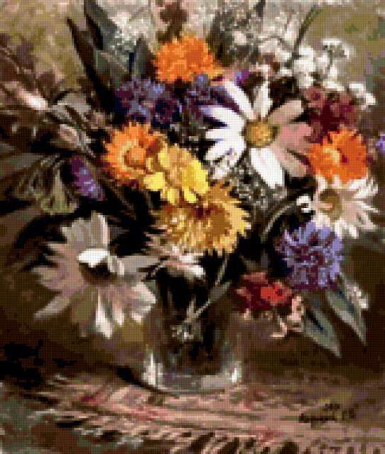 Ориентировочно так, схема вышивки «Variant 2», созданная автором Lamisa, будет выглядеть при отшиве на канве. Размер данной вышивки равен 161x190 крестов, при этом используется 76 цветов. Ключевые слова, по которым можно найти эту схему: цветы, cvety, букеты. Также, вы можете взглянуть на оригинальную картинку, соответствующую данной схеме вышивки.