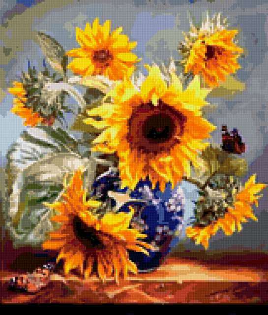 Ориентировочно так, схема вышивки «Variant 2», созданная автором Lamisa, будет выглядеть при отшиве на канве. Размер данной вышивки равен 162x190 крестов, при этом используется 73 цветов. Ключевые слова, по которым можно найти эту схему: цветы, cvety, букеты. Также, вы можете взглянуть на оригинальную картинку, соответствующую данной схеме вышивки.
