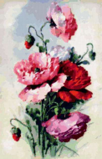 Ориентировочно так, схема вышивки «Variant 2», созданная автором Lamisa, будет выглядеть при отшиве на канве. Размер данной вышивки равен 122x190 крестов, при этом используется 66 цветов. Ключевые слова, по которым можно найти эту схему: цветы, cvety. Также, вы можете взглянуть на оригинальную картинку, соответствующую данной схеме вышивки.