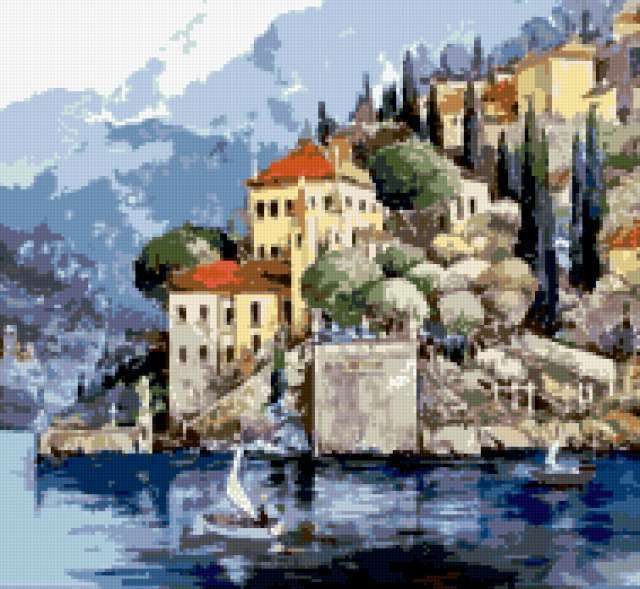 Ориентировочно так, схема вышивки «Variant 2», созданная автором Lamisa, будет выглядеть при отшиве на канве. Размер данной вышивки равен 189x174 крестов, при этом используется 53 цветов. Ключевые слова, по которым можно найти эту схему: средиземноморье, город, море, priroda. Также, вы можете взглянуть на оригинальную картинку, соответствующую данной схеме вышивки.