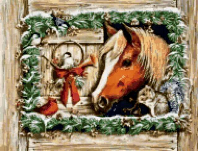 Ориентировочно так, схема вышивки «Variant 2», созданная автором Lamisa, будет выглядеть при отшиве на канве. Размер данной вышивки равен 190x145 крестов, при этом используется 49 цветов. Ключевые слова, по которым можно найти эту схему: животные, лошади . Также, вы можете взглянуть на оригинальную картинку, соответствующую данной схеме вышивки.