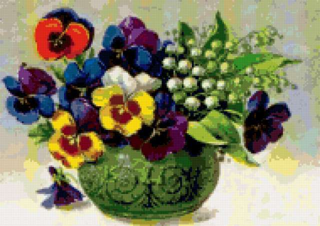 Ориентировочно так, схема вышивки «Variant 2», созданная автором Lamisa, будет выглядеть при отшиве на канве. Размер данной вышивки равен 190x134 крестов, при этом используется 69 цветов. Ключевые слова, по которым можно найти эту схему: цветы, cvety, букеты. Также, вы можете взглянуть на оригинальную картинку, соответствующую данной схеме вышивки.