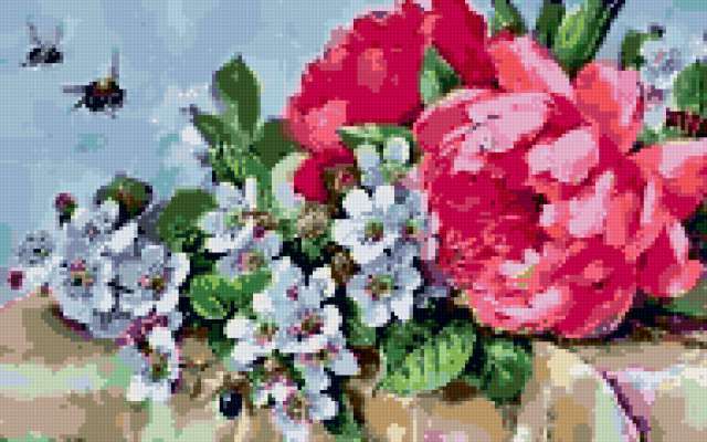 Ориентировочно так, схема вышивки «Variant 2», созданная автором Lamisa, будет выглядеть при отшиве на канве. Размер данной вышивки равен 190x119 крестов, при этом используется 49 цветов. Ключевые слова, по которым можно найти эту схему: цветы, cvety, насекомые. Также, вы можете взглянуть на оригинальную картинку, соответствующую данной схеме вышивки.