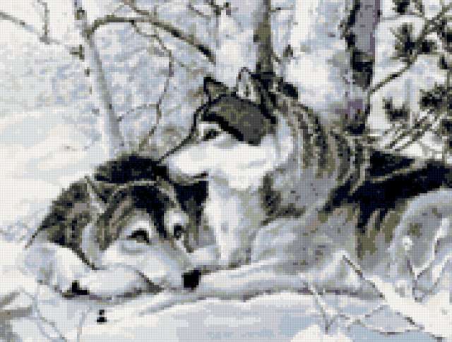 Ориентировочно так, схема вышивки «Variant 2», созданная автором Lamisa, будет выглядеть при отшиве на канве. Размер данной вышивки равен 182x138 крестов, при этом используется 22 цветов. Ключевые слова, по которым можно найти эту схему: животные, zhivotnye, волки, пара. Также, вы можете взглянуть на оригинальную картинку, соответствующую данной схеме вышивки.