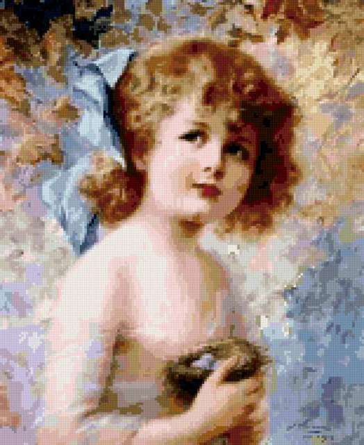 Ориентировочно так, схема вышивки «Variant 2b», созданная автором Lamisa, будет выглядеть при отшиве на канве. Размер данной вышивки равен 155x189 крестов, при этом используется 54 цветов. Ключевые слова, по которым можно найти эту схему: дети, девочка, портрет. Также, вы можете взглянуть на оригинальную картинку, соответствующую данной схеме вышивки.