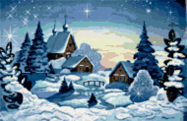 Ориентировочно так, схема вышивки «Variant 3», созданная автором Lamisa, будет выглядеть при отшиве на канве. Размер данной вышивки равен 190x123 крестов, при этом используется 38 цветов. Ключевые слова, по которым можно найти эту схему: зима, домик, деревня. Также, вы можете взглянуть на оригинальную картинку, соответствующую данной схеме вышивки.