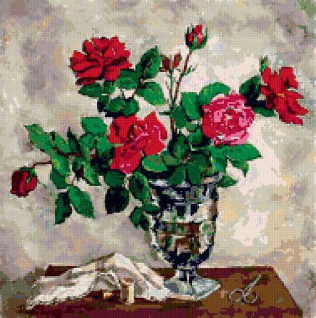 Ориентировочно так, схема вышивки «Variant 3», созданная автором Lamisa, будет выглядеть при отшиве на канве. Размер данной вышивки равен 189x190 крестов, при этом используется 40 цветов. Ключевые слова, по которым можно найти эту схему: цветы, букеты, розы. Также, вы можете взглянуть на оригинальную картинку, соответствующую данной схеме вышивки.